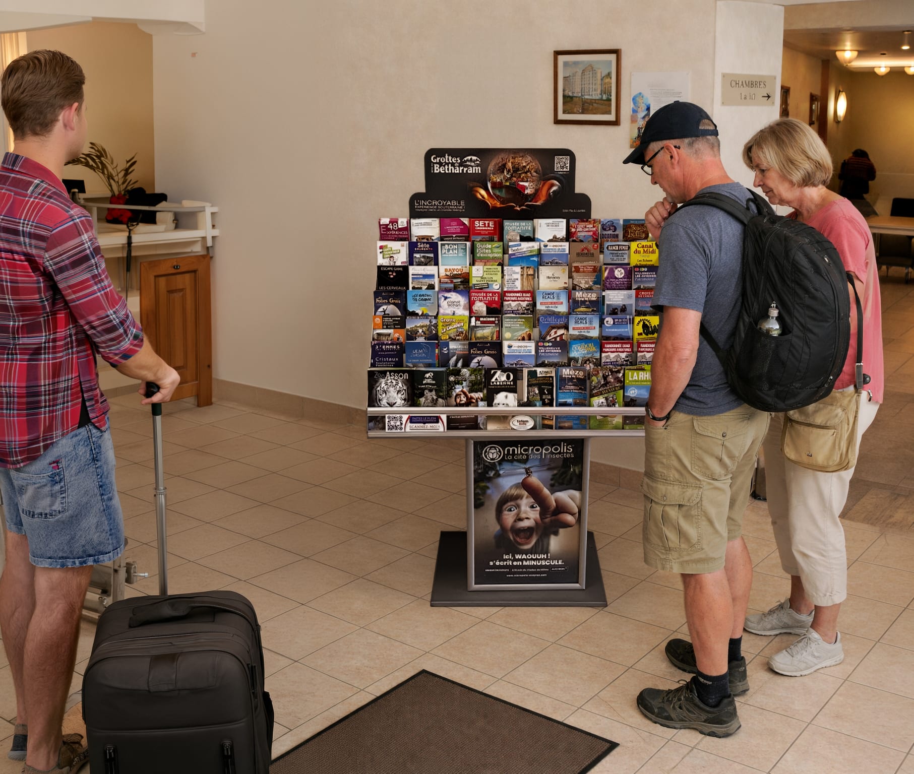 Le fronton est visible en premier. Il surplombe les brochures et crée un repère visuel fort. Que le présentoir soit installé dans un hôtel, un camping, un musée, une base de loisirs ou sites touristiques votre support devient instantanément repérable.